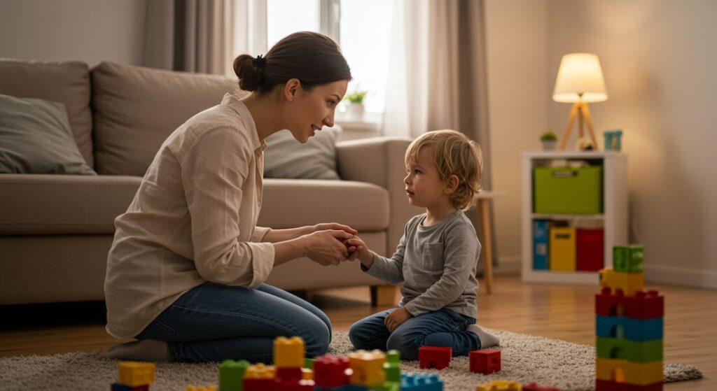 - 目線を合わせる:物理的に子どもの高さまでしゃがんで話す